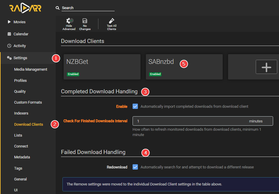 Select SABnzbd in step 5 and scroll down to the bottom of the new window where it says Completed Download Handling and check both boxes.