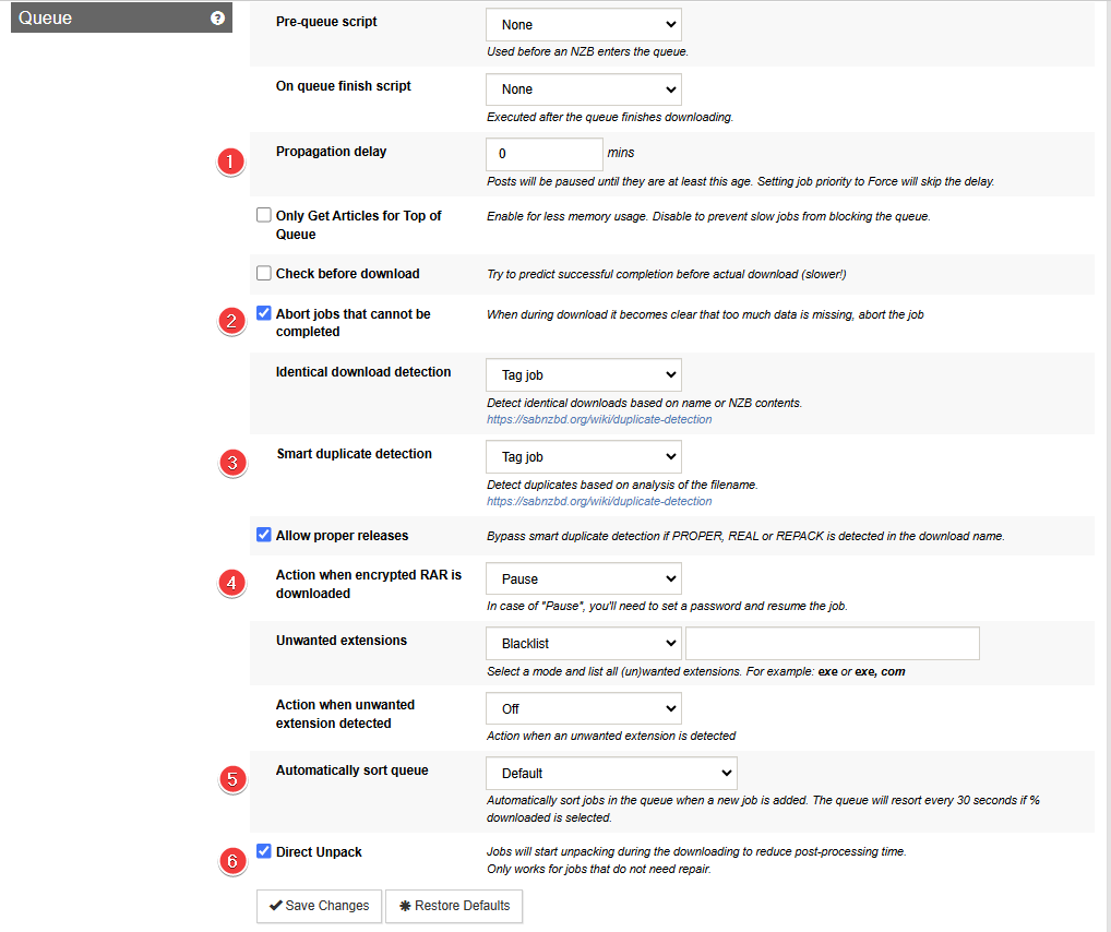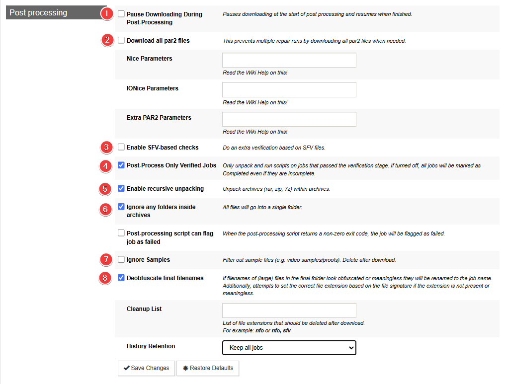 6. If your hardware isn't up to snuff, including CPU and/or IO performance, disabling Direct Unpack and/or enabling Pause Downloading During Post-Processing can help. Defaults are fine for most hardware though.
